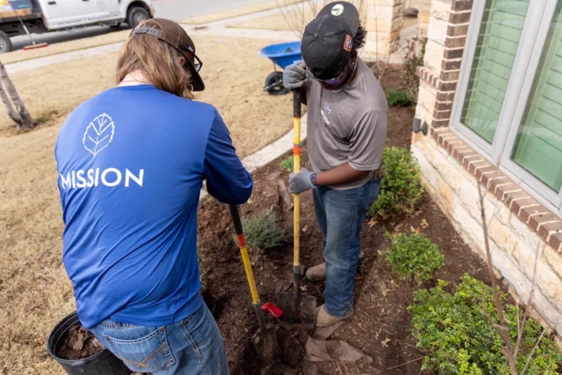 Never mulch volcanoes around trees. You see them everywhere in Lubbock commercial installs. They kill the tree by trapping moisture against the bark. Donut, not volcano.